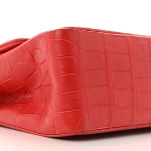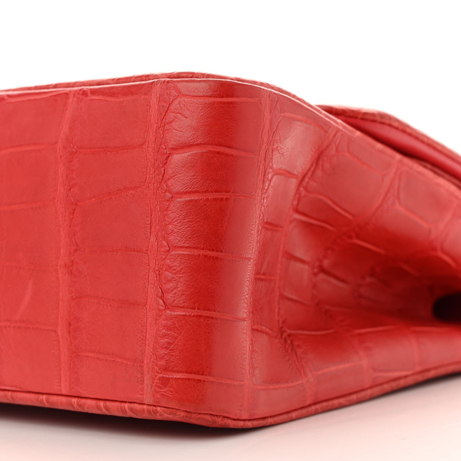 This is an authentic CHANEL Alligator Jumbo Double Flap in Red. This stunning shoulder flap bag is superbly crafted of luxurious exotic alligator leather in red. The shoulder straps are gold chain links threaded with leather. and the front half flap secures with a gold Chanel CC turn lock. This opens to a matte leather interior with zipper and flat pockets. This stylish shoulder bag is suitable for day and a sensation for evening with the timeless quality and style only from Chanel!