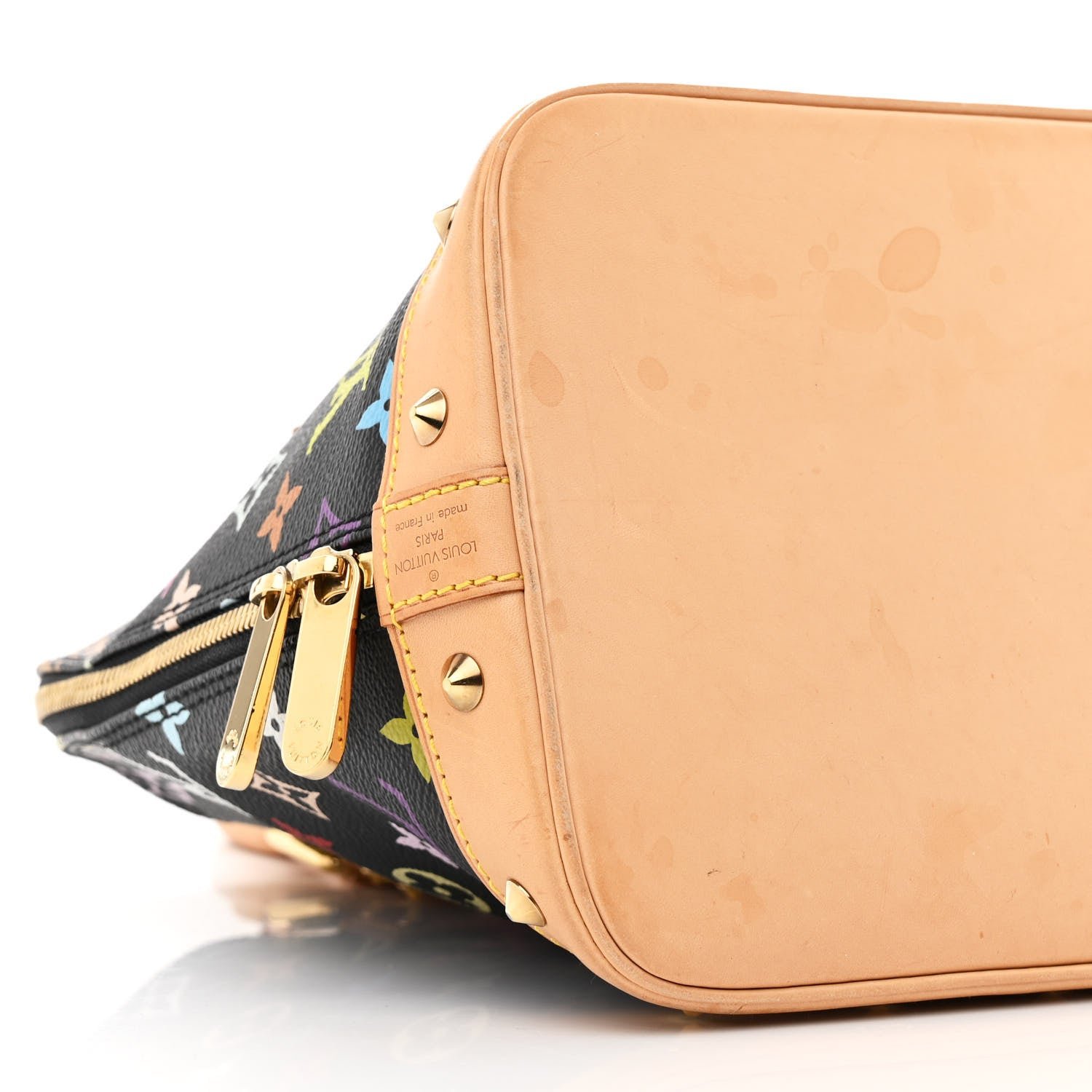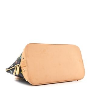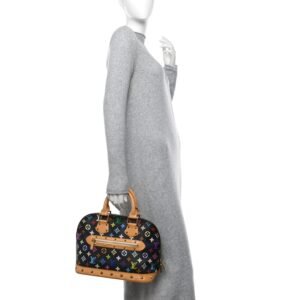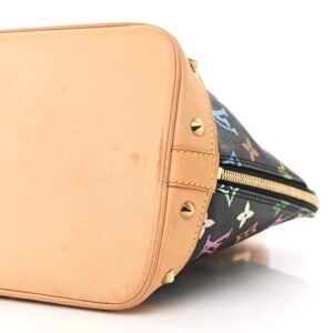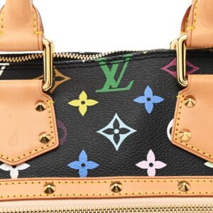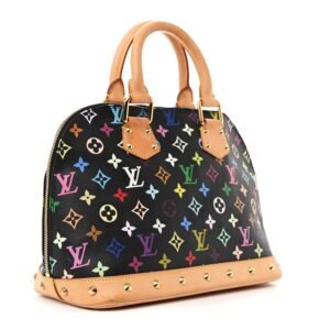 This is an authentic LOUIS VUITTON Monogram Multicolor Alma in Black. This stylish Alma is finely crafted of multicolor Louis Vuitton monogram in 33 vivid colors on black coated canvas. The handbag features vachetta cowhide leather top handles. trim. and base. lined with cone-shaped polished brass studs. The wrap-around zipper opens to a taupe microfiber interior with patch pockets.
