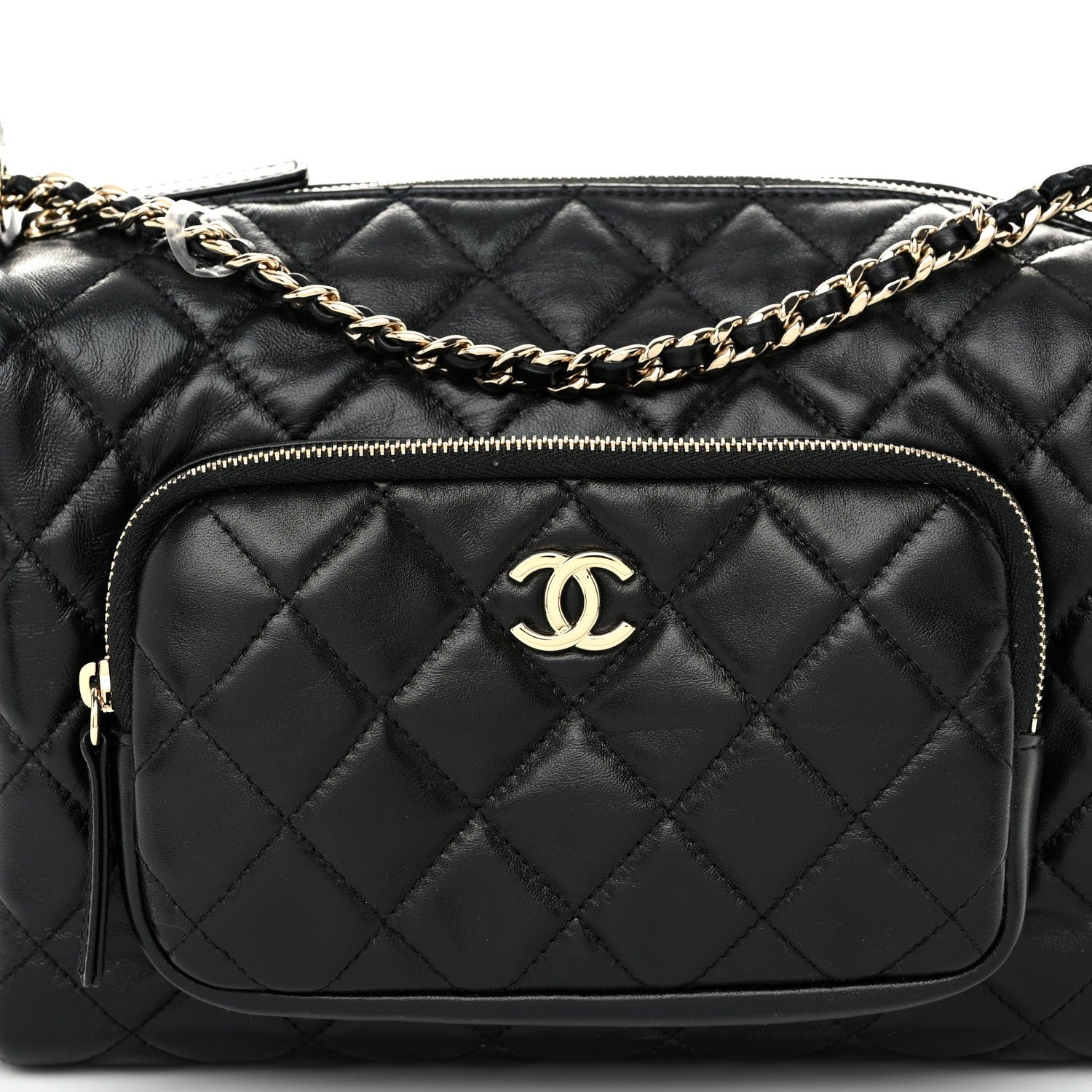 This is an authentic CHANEL Shiny Crumpled Lambskin Quilted Medium Preppy Pocket Camera Case in Black. This chic shoulder bag is finely crafted of luxurious diamond quilted lambskin leather in black. The bag features a leather threaded aged gold chain shoulder strap and exterior zipper and patch pockets with a gold Chanel CC logo. The main zipper opens to a black fabric interior.