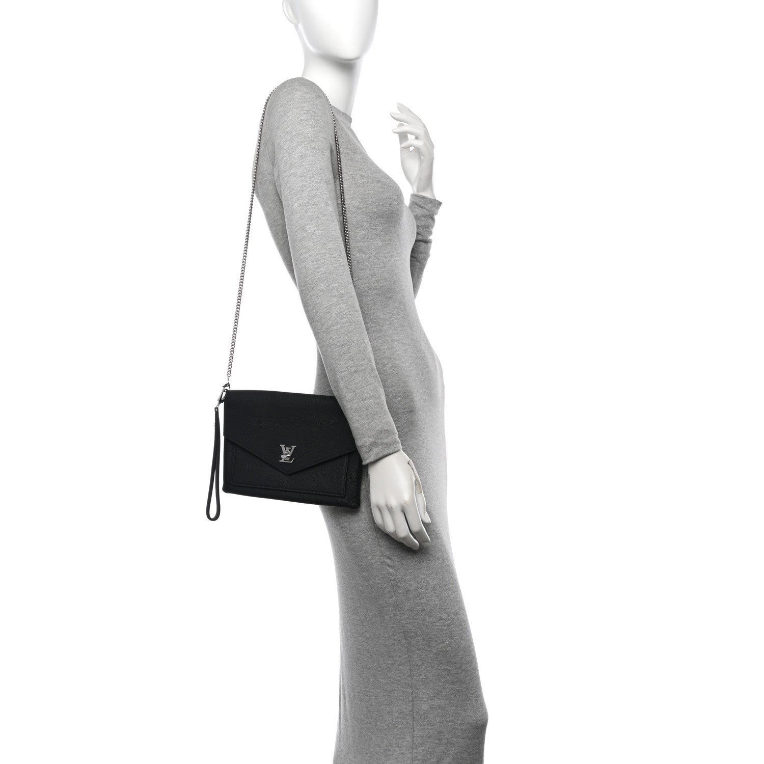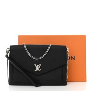 This is an authentic LOUIS VUITTON Soft Calfskin My Lockme Chain Pochette in Black.This stylish soft handbagis crafted ofsupple calfskin leather in black. The shoulder bag features a long removable chain shoulder strap. a rear pocket. and a silver LV closure on the front flap. This opens to a black microfiber interior with a zipper pocket. patch pocket. and card slots.